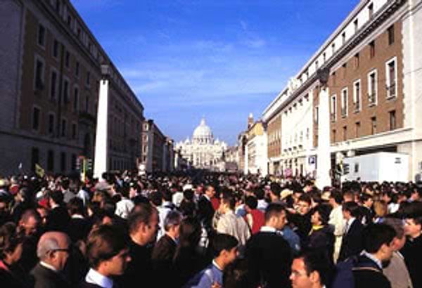 Une heure avant le début de la cérémonie, il était quasiment impossible de circuler dans les rues adjacentes où les fidèles se pressaient, leurs billets à la main, pour tenter de s'approcher des immenses écrans géants qui ont été installés jusqu'au château Saint-Ange, au bord du Tibre, tout au bout de la via della Conciliazone. La plupart des hommes avaient revêtu un costume, les prêtres leur clergyman, les familles étaient accompagnées de nombreux enfants et les jeunes constituaient, aux dires des organisateurs, plus de 40% des pèlerins. L'espagnol dominait largement dans les conversations. La langue du fondateur est en effet parlée par la plupart des membres de l'Opus Dei, quelle que soit leur nationalité. Ce dimance, ils sont venus de 84 pays pour accompagner Josémaria durant son entrée dans la cour des saints de l'Église catholique et une cinquantaine de cardinaux et d'évêques venus des cinq continents ont concélébré la cérémonie présidée par Jean-Paul II. Sur la gauche de l'autel, avaient pris place plusieurs centaines d'évêques ou d'archevêques ayant tenu à se rendre à Rome pour l'événement.