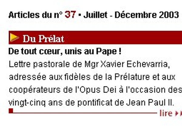 Au sommaire du numéro 37, dans la section « du Saint Siège » , on trouve l’homélie de Jean Paul II prononcée au sanctuaire marial de Pompéi, ainsi que les exhortations apostoliques Ecclesia in Europa et Pastores Gregis ; la section « du Prélat » , présente la lettre pastorale écrite par le prélat de l’Opus Dei à l’occasion du 25ème anniversaire du pontificat de Jean Paul II, ainsi que plusieurs homélies prononcées par Mgr Xavier Echevarria au cours de ce semestre.