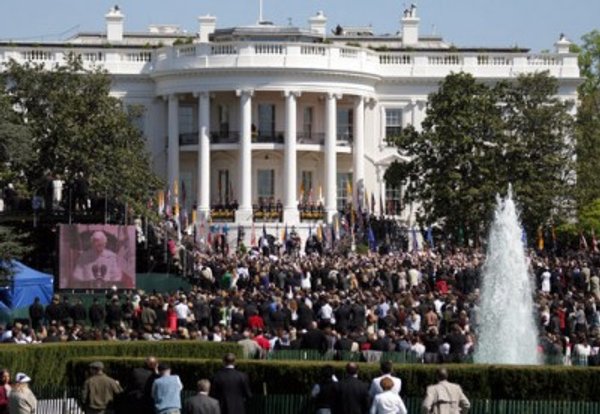 Peu avant 10 h 30' locales, Benoît XVI est arrivé à la Maison Blanche où il a été accueilli par le Président et Mme Bush. Le Pape, dont c'est aujourd'hui le 81 anniversaire, a prononcé un discours dans le parc devant 5.000 invités, en présence des plus hautes autorités civiles nationales, des Cardinaux et du Praesidium de la Conférence épiscopale, de la hiérarchie diocésaine locale mais aussi de l'Evêque d'Arlington, diocèse voisin où se trouve le célèbre cimetière qui outre la tombe de plusieurs Président abrite le repos de très nombreuses soldats tombés au combat.