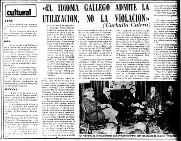 A crónica do acto conta como "Carballo Calero, tras un exordio antológico, habló de los medios de comunicación como instituciones de tipo social. Dijo que hay que recuperar el equilibrio, señalando que las actividades culturales están frecuentemente mediatizadas por la política. Se requiere un sosiego que es incompatible con la agitación existente. Aludió a las opiniones que de él se recogen en magnetófono y a cómo después son «corregidas» en la transcripción, con lo que los profesionales de la lingüística resultan «informados» por legos en la materia. Después manifestó que hay «una conciencia patológica del idioma». Y concluyó diciendo que «el idioma gallego permite la utilización, no la violación. Seamos, pues, honestos». Tamén alude a crónica periodísta a intervención de Filgueira Valverde facendo un repaso cronolóxico do galego escrito con valor cultural.