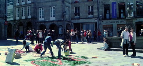 La tradición de las alfombras de flores en las procesiones de Corpus Christi tuvo ayer un primer capítulo en Compostela, con el tapíz que un grupo de vecinas elaboró con pétalos y ramas en la plaza do Toural. Desde las siete y media de la mañana Magdalena Sánchez y el grupo de voluntarias a las que consiguió animar para esta tarea estuvieron trabajando sobre un dibujo con alusiones a la Jornada Mundial de la Juventud que se celebrará este verano en Brasil. Magdalena, que tiene la ilusión de que las alfombras de flores se consoliden como una tradición más en Compostela, se mostraba ayer muy agradecida con las floristerías que les aportaron la materia prima para decorar la plaza "guardándonos la mercancía que no podían vender", mientras peleaba junto a sus compañeras contra el viento que amenazaba su opera prima.