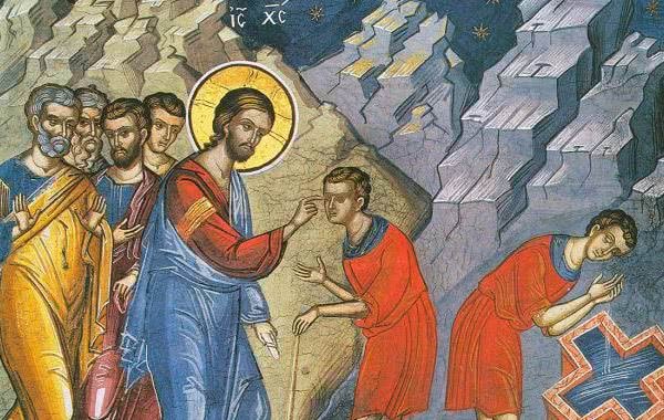 Kad su izlazili iz Jerihona, pođe za njim silan svijet. I gle, dva slijepca sjeđahu kraj puta. Čuvši da Isus prolazi, povikaše: "Gospodine, smiluj nam se, sine Davidov!" Mnoštvo ih je ušutkivalo, ali oni još jače viknuše: "Gospodine, smiluj nam se, sine Davidov!" Isus se zaustavi, dozovi ih i reče: Što hoćete da vam učinim?" Kažu mu: "Gospodine, da nam se otvore oči." Isus se ganut dotače njihovih očiju i oni odmah progledaše. I pođoše za njim. (Mt 20:29-34)