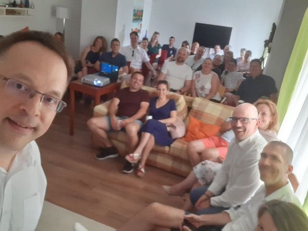A mise után külön csoportokba kerültek a kisgyerekek, a nagyobbak és a felnőttek. Játék, foci, ének és tánc várt a gyerekekre. A felnőttek pedig a nappaliban egy jóhangulatú előadáson vehettek részt az apaszerepről. Süveges Gergő volt az előadó, aki nemcsak előadott, hanem személyes és vicces eseteket mesélt a saját családjából, példákat hozott a szülők és gyermekeik közötti kapcsolat kihívásaira és örömeire. A hallgatóság hol nevetve, hol magára ismerve figyelt Gergőre, aki kérdésekkel is előmozdította, hogy párbeszéd és együtt gondolkodás induljon el. Gergő arra bátorított mindenkit, hogy egy kis dolgot vigyen magával, mint házi feladatot, és azt próbálja meg a gyermekeivel. A hallgatóságot egyébként nemcsak gyakorló szülők alkották, hanem fiatalok is, akik a Családképző Fórum még nem házasoknak szóló képzésein vesznek részt. Nagyon vidám és felszabadult volt mindenki, és a szervezők is nagyon elégedettek voltak a Süveges Gergőtől kapott üzenettel.