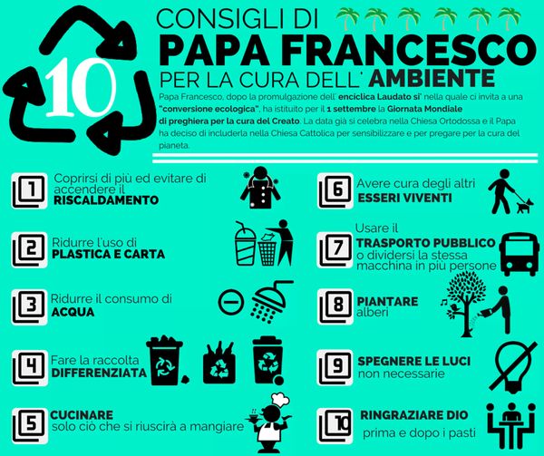 Dopo aver promulgato l’enciclica Laudato si’ nella quale ci invita a una “conversione ecologica”, Papa Francesco ha stabilito di celebrare il 1° settembre la Giornata Mondiale di preghiera per la cura della Creato. Questa ricorrenza si celebra già nella Chiesa ortodossa, e il Papa ha deciso di includerla nella Chiesa cattolica al fine di aiutare tutti a prendere coscienza della necessità di prendersi cura del pianeta.
