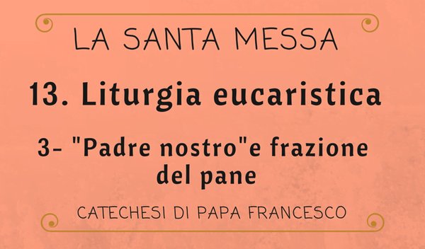 Continuiamo con la Catechesi sulla Santa Messa. Nell’ultima Cena, dopo che Gesù prese il pane e il calice del vino, ed ebbe reso grazie a Dio, sappiamo che «spezzò il pane». A quest’azione corrisponde, nella Liturgia eucaristica della Messa, la frazione del Pane, preceduta dalla preghiera che il Signore ci ha insegnato, cioè del “Padre Nostro”.