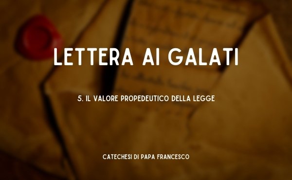 San Paolo, innamorato di Gesù Cristo e che aveva capito bene cosa fosse la salvezza, ci ha insegnato che i «figli della promessa» (Gal 4,28) - cioè tutti noi, giustificati da Gesù Cristo -, non stanno sotto il vincolo della Legge, ma sono chiamati allo stile di vita impegnativo nella libertà del Vangelo. La Legge, però, esiste. Ma esiste con un altro modo: la stessa Legge, i Dieci Comandamenti, ma con un altro modo, perché da se stessa non può giustificare una volta che è venuto il Signore Gesù. E perciò, nella catechesi di oggi io vorrei spiegare questo. E ci chiediamo: qual è, secondo la Lettera ai Galati, il ruolo della Legge? Nel brano che abbiamo ascoltato, Paolo sostiene che la Legge è stata come un pedagogo. È una bella immagine, quella del pedagogo di cui abbiamo parlato nell’udienza scorsa, un’immagine che merita di essere compresa nel suo giusto significato.