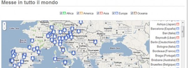 Presentiamo una mappa interattiva con le informazioni circa le Messe che avranno luogo nei cinque continenti intorno a questa data. Le informazioni saranno aggiornate quotidianamente. Per facilitare la ricerca i continenti sono stati classificati per colore e la barra laterale permette di individuare i paesi disposti in ordine alfabetico.
