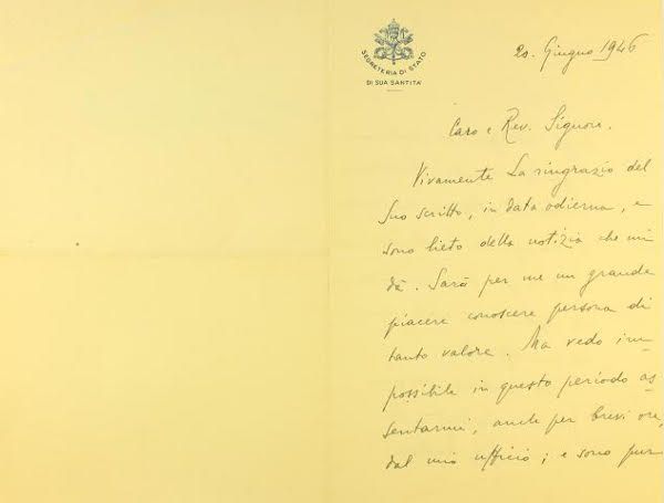 Il primo incontro di Giovanni Battista Montini con il fondatore dell'Opus Dei, pochi giorni dopo di questo biglietto, avviene l'8 luglio. Il futuro san Paolo VI spiegò a san Joseamría e al beato Álvaro che era contentissimo dei racconti sull'espansione apostolica dell'Opus Dei fra gli universitari. Il lavoro con gli studenti era una sua passione pastorale che risaliva ai tempi del suo incarico come assistente della FUCI (Federazione Universitaria Cattolica Italiana).