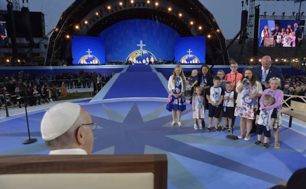 Momento culminante della mia visita è stata la grande festa con le famiglie, sabato sera, nello stadio di Dublino, seguita domenica dalla Messa nel Phoenix Park. Nella Veglia abbiamo ascoltato testimonianze molto toccanti di famiglie che hanno sofferto per le guerre, famiglie rinnovate dal perdono, famiglie che l’amore ha salvato dalla spirale delle dipendenze, famiglie che hanno imparato a usare bene telefonini e tablet e a dare priorità al tempo speso insieme. E sono risaltati il valore della comunicazione tra generazioni e il ruolo specifico che spetta ai nonni nel consolidare i legami familiari e trasmettere il tesoro della fede. Oggi – è duro dirlo – ma sembra che i nonni disturbano. In questa cultura dello scarto, i nonni si “scartano”, si allontanano. Ma i nonni sono la saggezza, sono la memoria di un popolo, la memoria delle famiglie! E i nonni devono trasmettere questa memoria ai nipotini. I giovani e i bambini devono parlare con i nonni per portare avanti la storia. Per favore: non scartare i nonni. Che siano vicini ai vostri figli, ai nipotini.