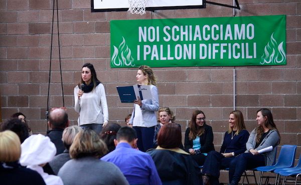 «Noi schiacciamo i palloni difficili» si legge in uno striscione dietro al canestro, nella palestra della SAFI