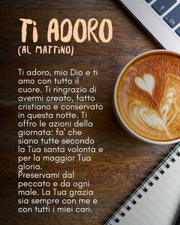 Ti adoro, mio Dio e ti amo con tutto il cuore. Ti ringrazio di avermi creato, fatto cristiano e conservato in questa notte. Ti offro le azioni della giornata fa che siano tutte secondo la Tua santa volontà e per la maggior Tua gloria.