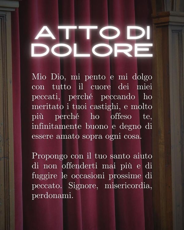 Mio Dio, mi pento e mi dolgo con tutto il cuore dei miei peccati, perché peccando ho meritato i tuoi castighi, e molto più perché ho offeso te, infinitamente buono e degno di essere amato sopra ogni cosa. Propongo con il tuo santo aiuto di non offenderti mai più e di fuggire le occasioni prossime di peccato. Signore, misericordia, perdonami.