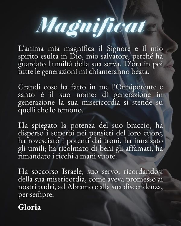 L'anima mia magnifica il Signore e il mio spirito esulta in Dio, mio salvatore, perché ha guardato l'umiltà della sua serva. D'ora in poi tutte le generazioni mi chiameranno beata.