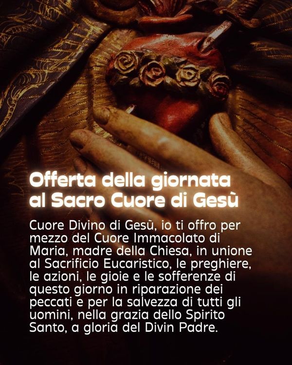 Cuore Divino di Gesù, io ti offro per mezzo del Cuore Immacolato di Maria, madre della Chiesa, in unione al Sacrificio Eucaristico, le preghiere, le azioni, le gioie e le sofferenze di questo giorno in riparazione dei peccati e per la salvezza di tutti gli uomini, nella grazia dello Spirito Santo, a gloria del Divin Padre.
