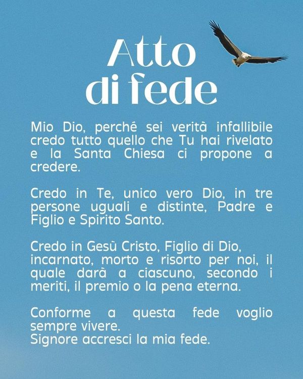 Mio Dio, perché sei verità infallibile credo tutto quello che Tu hai rivelato e la Santa Chiesa ci propone a credere. Credo in Te, unico vero Dio, in tre persone uguali e distinte, Padre e Figlio e Spirito Santo. Credo in Gesù Cristo, Figlio di Dio, incarnato, morto e risorto per noi, il quale darà a ciascuno, secondo i meriti, il premio o la pena eterna. Conforme a questa fede voglio sempre vivere. Signore accresci la mia fede.