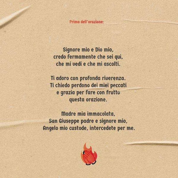 Signore mio e Dio mio, credo fermamente che sei qui, che mi vedi, che mi ascolti. Ti adoro con profonda riverenza. Ti chiedo perdono dei miei peccati e la grazia per fare con frutto questa orazione. Madre mia Immacolata, san Giuseppe padre e signore mio, Angelo mio custode intercedete per me.