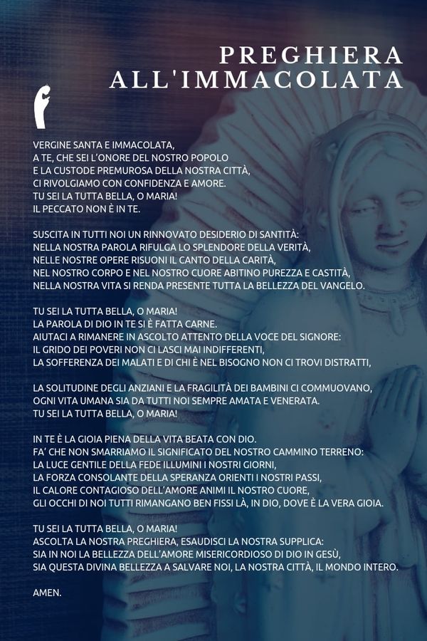 La Vergine Santa, così premurosa nei tuoi riguardi, si degni di benedire questa mia fatica scolastica, così che per mezzo di essa io possa ricompensare i sacrifici dei miei genitori e aprirmi ad un servizio più attento più qualificato verso i fratelli.