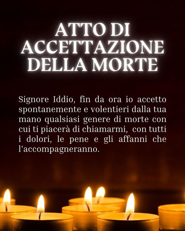 Signore Iddio, fin da ora io accetto spontanemente e volentieri dalla tua mano qualsiasi genere di morte con cui ti piacerà di chiamarmi, con tutti i dolori, le pene e gli affanni che l'accompagneranno.