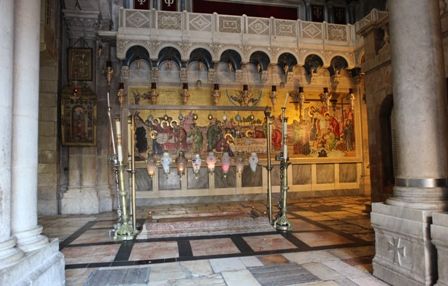 Scendendo dal Calvario e tornando all’atrio della basilica, incontriamo la Pietra dell’Unzione, che è molto venerata dai cristiani ortodossi. Si tratta di una lastra di pietra rossiccia con venature bianche, che ricorda le cure che Giuseppe d’Arimatea e Nicodemo dedicarono al corpo di Gesù.