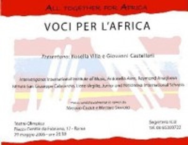 Lunedì 29 maggio, presso il Teatro Olimpico (Piazza Gentile da Fabriano, 17 ore 20,30) in Roma, Harambee presenta: "Voci per l'Africa", uno spettacolo musicale a sostegno dell’Africa messo amichevolmente in scena da MASSIMO CINQUE e MASSIMO SANTORO.