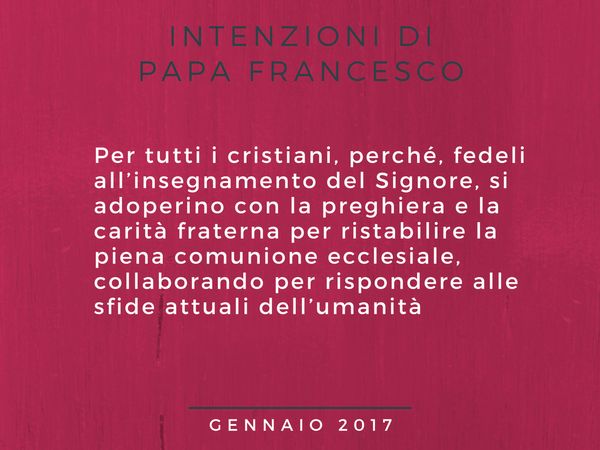 Per tutti i cristiani, perché, fedeli all’insegnamento del Signore, si adoperino con la preghiera e la carità fraterna per ristabilire la piena comunione ecclesiale, collaborando per rispondere alle sfide attuali dell’umanità