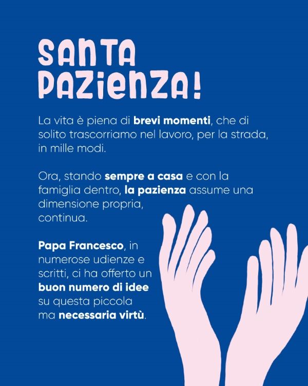 1. La pazienza consiste nel sopportare, nel portare sulle spalle le cose sgradevoli della vita. Anche le prove; è la capacità di saper dialogare con i limiti (Meditazione a Santa Marta del 12 febbraio 2018).