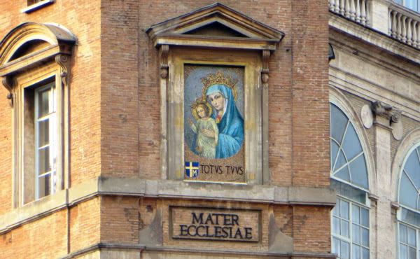 Quando lo riferirono a don Álvaro, egli incaricò subito l’architetto Javier Cotelo di pensare a dove si sarebbe potuto collocare un’immagine della Madonna che si potesse ben vedere da piazza San Pietro, per attirare gli sguardi di tutti i cristiani che giungono a Roma videre Petrum, per vedere il Papa. Cotelo fece un progetto che prevedeva un mosaico dell’immagine Mater Ecclesiae, il cui originale è dentro la basilica, in un luogo ben visibile dalla piazza: un angolo del palazzo apostolico. Al Papa piacque molto l’idea e chiese che venisse realizzata. L’8 dicembre 1981, durante la recita dell’Angelus, dalla finestra della sua stanza benedisse l’immagine che in effetti si può vedere anche da lì. Il Papa disse: «Nella cornice di questa piazza stupenda mancava un’immagine che richiamasse anche visibilmente la presenza di Colei che la Chiesa, edotta dallo Spirito Santo, con affetto di pietà filiale venera come Madre amatissima (Lumen gentium, 53). Sono lieto di inaugurare, nella solennità dell’Immacolata Concezione della Beata Vergine Maria, questa testimonianza del nostro amore e della nostra devozione… Benedirò ora l’immagine della Madonna Madre della Chiesa, esprimendo l’auspicio che quanti verranno in questa piazza levino verso di Lei lo sguardo, per rivolgerle, con sentimento di filiale fiducia il proprio saluto e la propria preghiera».
