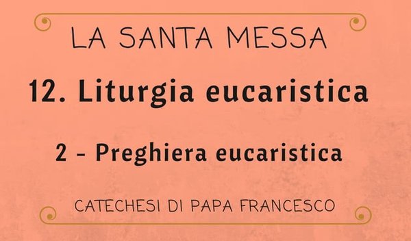 Continuiamo le catechesi sulla Santa Messa e con questa catechesi ci soffermiamo sulla Preghiera eucaristica. Concluso il rito della presentazione del pane e del vino, ha inizio la Preghiera eucaristica, che qualifica la celebrazione della Messa e ne costituisce il momento centrale, ordinato alla santa Comunione. Corrisponde a quanto Gesù stesso fece, a tavola con gli Apostoli nell’Ultima Cena, allorché «rese grazie» sul pane e poi sul calice del vino (cfr Mt 26,27; Mc 14,23; Lc, 22,17.19; 1 Cor 11,24): il suo ringraziamento rivive in ogni nostra Eucaristia, associandoci al suo sacrificio di salvezza.