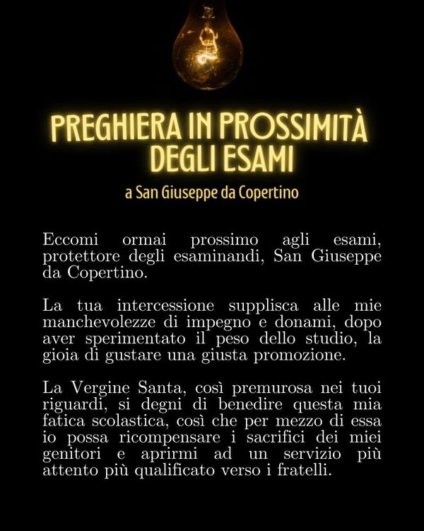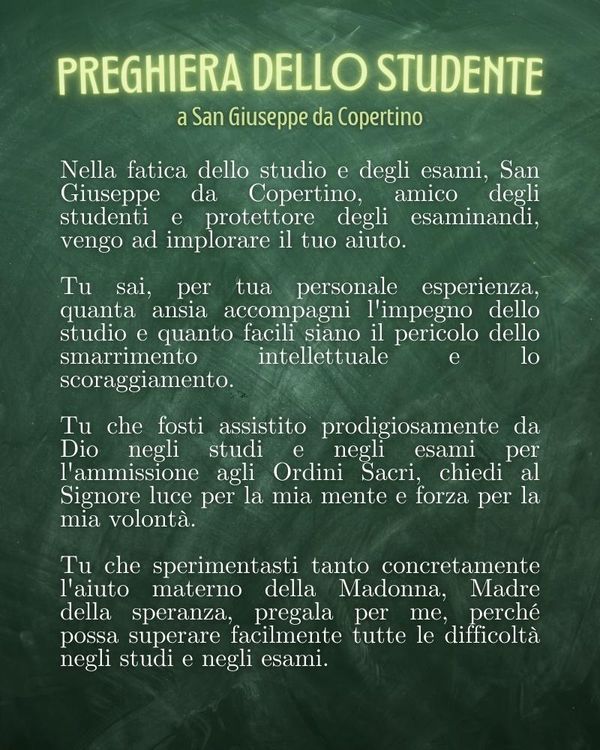 Nella fatica dello studio e degli esami, San Giuseppe da Copertino, amico degli studenti e protettore degli esaminandi, vengo ad implorare il tuo aiuto.