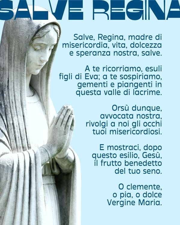 e speranza nostra, salve. A te ricorriamo, esuli figli di Eva; a te sospiriamo, gementi e piangenti in questa valle di lacrime. Orsù dunque, avvocata nostra, rivolgi a noi gli occhi tuoi misericordiosi. E mostraci, dopo questo esilio, Gesù, il frutto benedetto del tuo seno. O clemente, o pia, o dolce Vergine Maria.