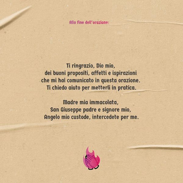 Ti ringrazio mio Dio dei buoni propositi, affetti e ispirazioni che mi hai comunicato in questa orazione. Ti chiedo aiuto per metterli in pratica. Madre mia Immacolata, san Giuseppe padre e signore mio, Angelo mio custode intercedete per me.