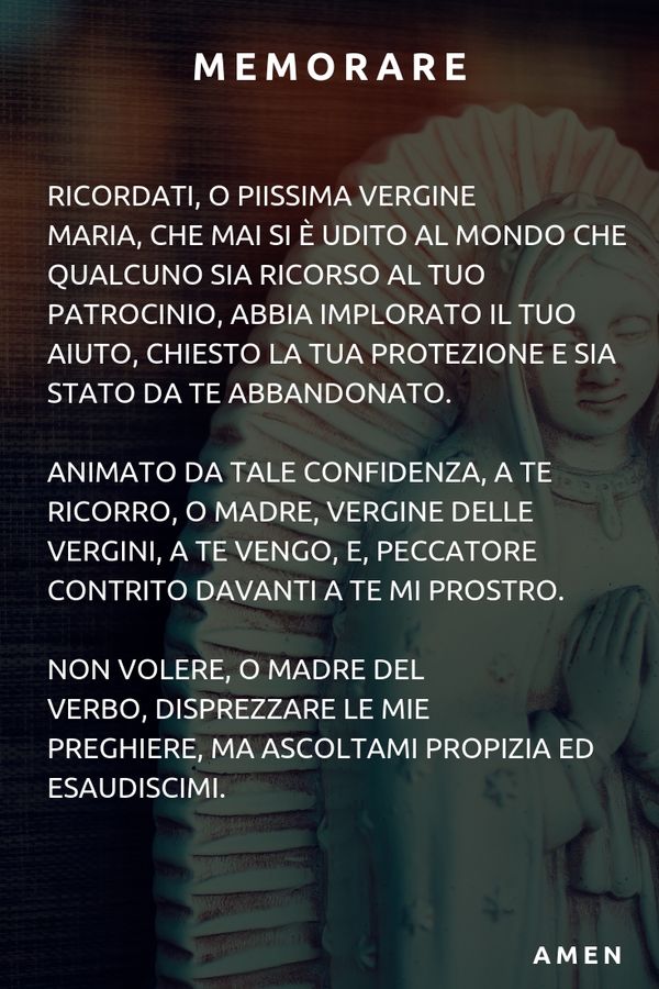Ricordati, o piissima Vergine Maria, non essersi mai udito al mondo che alcuno abbia ricorso al tuo patrocinio, implorato il tuo aiuto, chiesto la tua protezione e sia stato abbandonato.