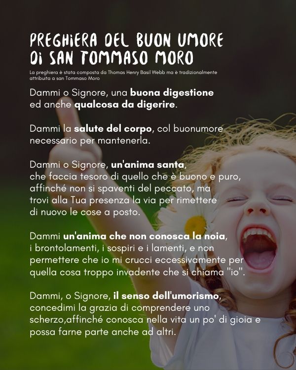 Dammi, o Signore, il senso dell'umorismo, concedimi la grazia di comprendere uno scherzo,affinché conosca nella vita un po' di gioia e possa farne parte anche ad altri.