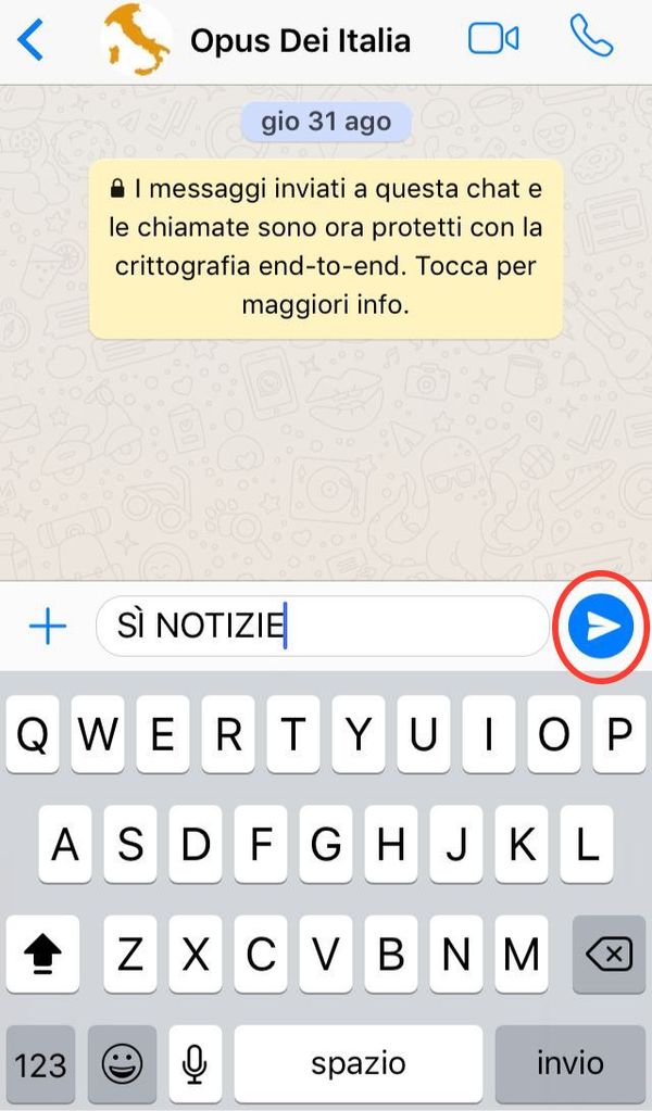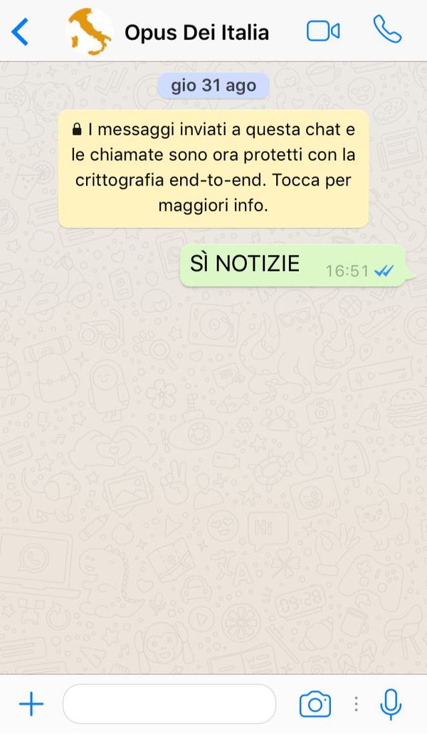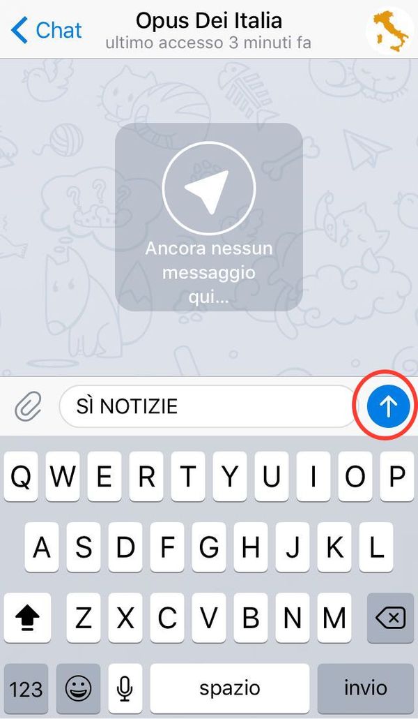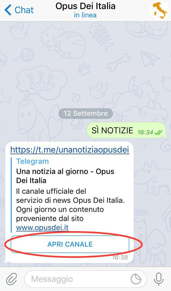 Dopo aver cliccato su Servizio News Telegram Opus Dei Italia, avrete la possibilità di scrivere un messaggio. Digitare SÌ NOTIZIE e fare click su invia.
