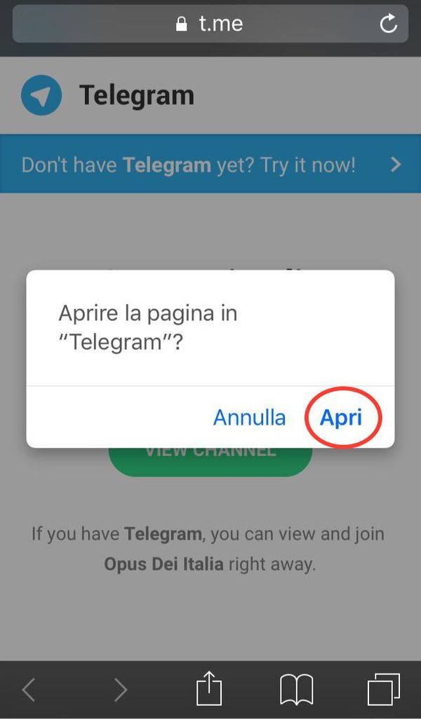 Dopo aver cliccato APRI IN TELEGRAM, sarete indirizzati direttamente nell'applicazione, sul canale Opus Dei Italia. Fare clic su UNISCITI.