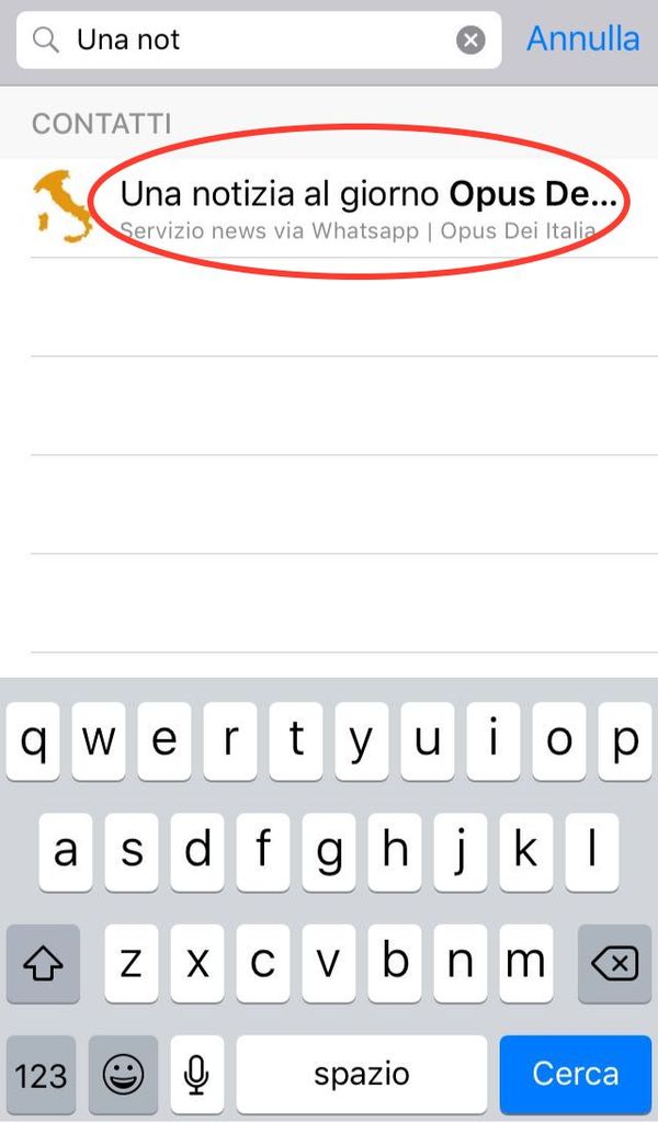 Questa volta è necessario digitare nello spazio bianco con su scritto CERCA le prime lettere del nome con il quale avete salvato il contatto del servizio "Una notizia al giorno" di Opus Dei Italia. Mentre digitate le lettere, sotto lo spazio bianco apparirà il nome intero del contatto. Adesso cliccate sul nome del contatto.