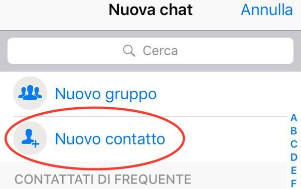 Attivare il servizio "Una notizia al giorno" via Whatsapp è molto semplice. Per prima cosa è necessario inserire il contatto del servizi tra i propri contatti di Whatsapp. Ecco come fare: dopo aver aperto l'applicazione Whatsapp dal vostro smartphone, fare click sul pulsante in alto a destra, NUOVA CHAT.