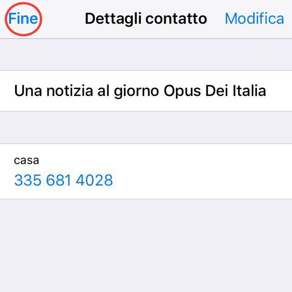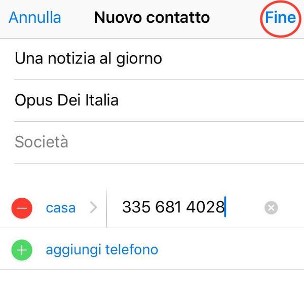 Per aggiungere il contatto Ufficio Comunicazione Opus Dei Italia è sufficiente scrivere un nome e il numero di telefono 3356814028. Non è necessario scrivere un nome in particolare, l'importante è che sia un nome che vi riusciate a ricordare in un secondo momento. Una volta scritti nome e numero di telefono, cliccare in alto a destra sull'opzione FINE.