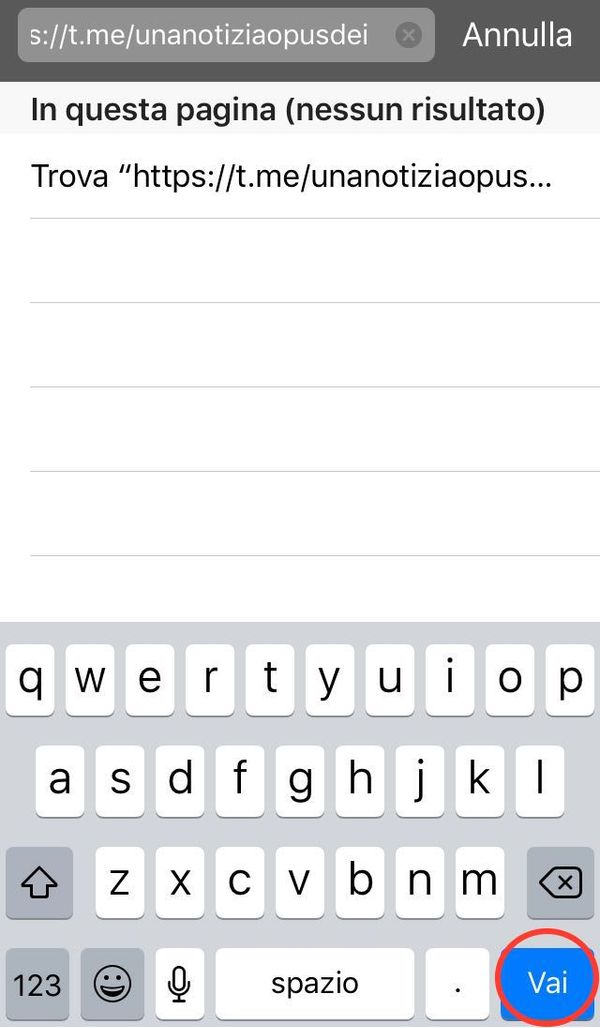 In alternativa è possibile accedere a un qualunque motore di ricerca, ad esempio Safari, da qualunque dispositivo mobile. Nello spazio di ricerca digitare https://t.me/unanotiziaopusdei e cliccare su VAI.