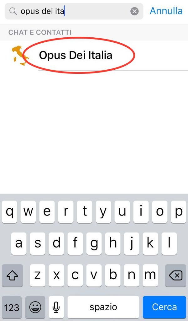 Adesso nello spazio bianco con su scritto CERCA MESSAGGI O UTENTI digitare Opus Dei Italia. Mentre digiti i caratteri, ti apparirà la possibilità di cliccare sul contatto Opus Dei Italia.