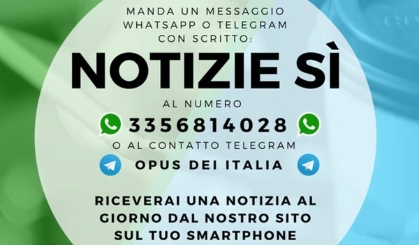 Il numero del servizio "Una notizia al giorno" è 3356814028. Per attivare il servizio Whatsapp è sufficiente inviare a questo numero un messaggio con scritto SÌ NOTIZIE. Per attivare il servizio su Telegram basta cercare il canale pubblico Una notizia al giorno - Opus Dei Italia https://t.me/unanotiziaopusdei.