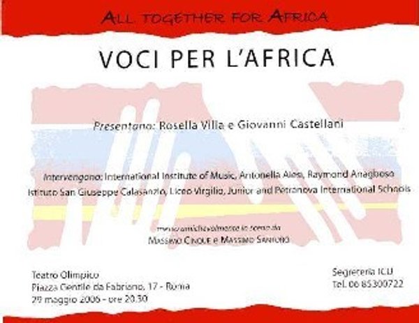 Il 29 maggio, presso il Teatro Olimpico in Roma, Harambee presenta: "Voci per l'Africa", Rosella Villa e Giovanni Castellani con l'International Institute of Music e Antonella Aiesi e la collaborazione degli Istituti Ada Negri, Junior International, Petranova International, San Giuseppe Calasanzio, Virgilio. Messo amichevolmente in scena da Massimo Cinque.