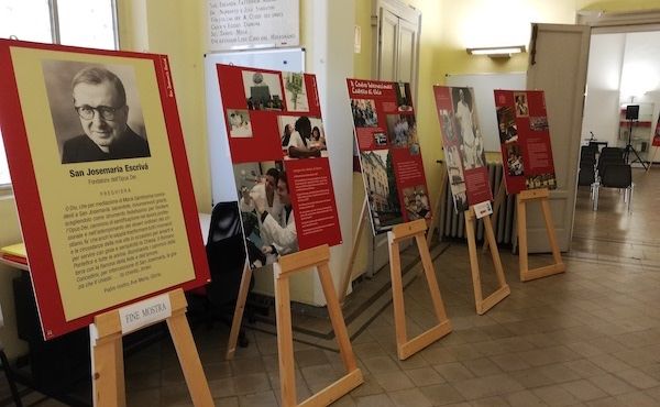 A questo link è possibile trovare i file dei diciannove pannelli della mostra in formato pdf e in alta risoluzione, pronti per la stampa. Una volta stampati sono facili da allestire e montare. Qui e nella foto in basso un esempio di un allestimento della mostra, allestita per la prima volta a Melegnano in occasione della festa di san Josemaría del 26 giugno.