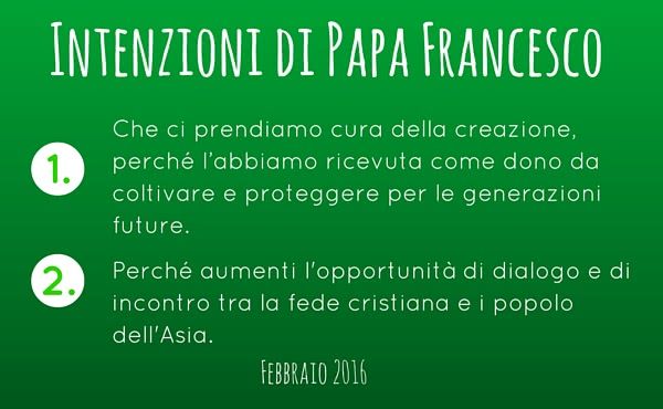 La relazione tra la povertà e la fragilità del pianeta richiede un altro modo di gestire l’economia e il progresso immaginando un nuovo stile di vita. Perché abbiamo bisogno di una conversione che ci unisca tutti: liberarci dalla schiavitù del consumismo. Questo mese ti rivolgo una richiesta speciale: che ci prendiamo cura della creazione, perché l’abbiamo ricevuta come dono da coltivare e proteggere per le generazioni future. Prendersi cura della nostra casa comune".