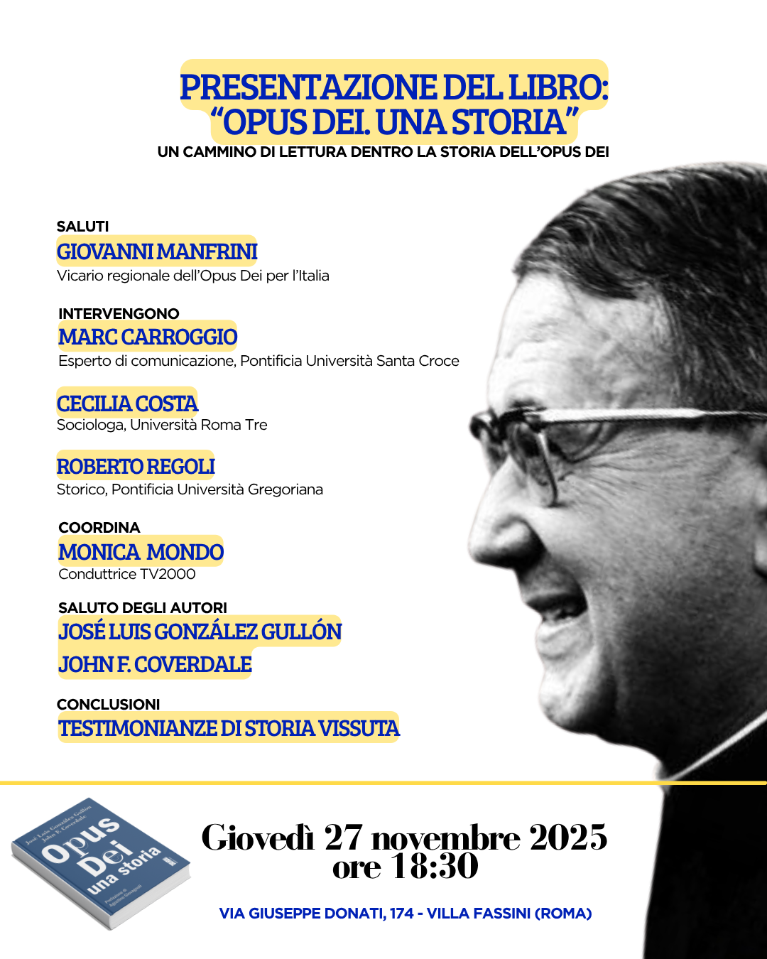 Nel corso dell’evento, i relatori Marc Carroggio, esperto di comunicazione della Pontificia Università della Santa Croce, Cecilia Costa, sociologa dell’Università Roma Tre e Roberto Regoli, storico della Pontificia Università Gregoriana - moderati da Monica Mondo, conduttrice di Tv2000 - ripercorreranno, attraverso i racconti di Gullón e Coverdale, la storia dell’Opus Dei, ovvero «la storia di tanti, donne e uomini, di ogni parte del mondo e di ogni ceto sociale che hanno riscoperto la chiamata universale alla santità nel quotidiano».