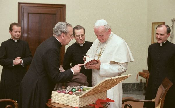Non era trascorso molto tempo quando don Álvaro gli fece arrivare la notizia che per il giorno dopo, festa di San Nicola, aveva pronte le arance che i polacchi sono soliti regalarsi in quella data. Il Papa rimase sorpreso e volle riceverlo la mattina seguente. Don Álvaro, insieme alle arance, gli portò diversi libri di san Josemaría – che ovviamente non era ancora santo –, e che interessarono molto il Papa, al punto che poi li fece collocare nella stanza dove lavoravano i suoi collaboratori nella preparazione di discorsi e omelie. In quei mesi ebbi la grazia che il Papa mi chiedesse di andare a colazione e a pranzo da lui per parlare in spagnolo, in vista del viaggio apostolico del Papa in Messico.