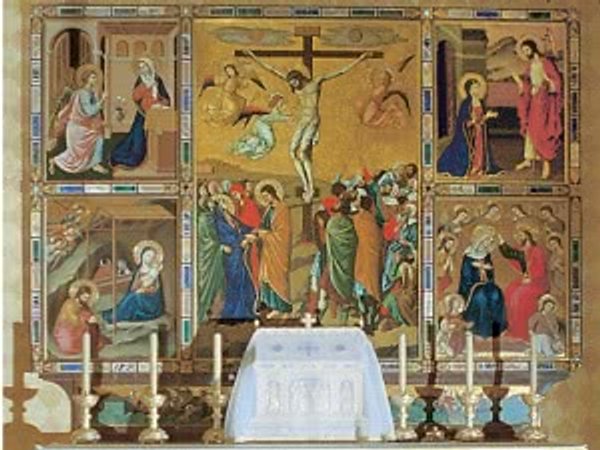 Il catino absidale è rivestito in mosaici dorati con al centro l'immagine della Madonna circondata dagli Apostoli, mentre sopra il sigillo dell'Opus Dei è al centro di un volo di angeli, allegoria della fondazione dell'opera che avvenne il 2 ottobre 1928, festa appunto degli angeli custodi.