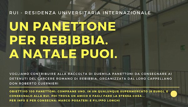 Quest’anno abbiamo avuto un’idea in più. Un amico della RUI, don Roberto Guernieri, ospite all’inaugurazione dell’anno accademico, è da parecchi anni cappellano del carcere romano di Rebibbia. Per Natale era intenzionato a raccogliere duemila panettoni, uno per ciascun detenuto. Conoscendoci, ci ha chiamati: vi andrebbe di collaborare…? Alcuni residenti e la direzione della Residenza si sono entusiasmati, e la campagna è partita. Su facebook, nelle bacheche reali, nei messaggi di whatsapp la locandina dell’iniziativa ha cominciato a circolare, invitando amici e compagni di università a presentarsi alla RUI con un panettone (o più) a testa.