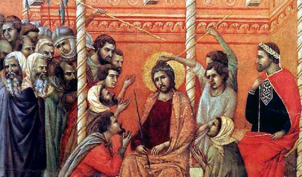 Allora Pilato fece prendere Gesù e lo fece flagellare. E i soldati, intrecciata una corona di spine, gliela posero sul capo e gli misero addosso un mantello di porpora; quindi gli venivano davanti e gli dicevano: “Salve, re dei Giudei!”. E gli davano schiaffi.