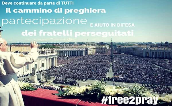 Invito anche, come suggerito dai vescovi italiani, a dare voce alle storie di tanti testimoni della fede utilizzando il web e i propri spazi sui social network per diffondere le loro testimonianze usando l'hashtag #free2pray: preghiamo per un mondo in cui ciascuno sia libero di pregare. Anche questo è un modo per conoscere e far conoscere l'esempio di chi, pur nelle difficoltà estreme, è capace di mettere al primo posto la fede.
